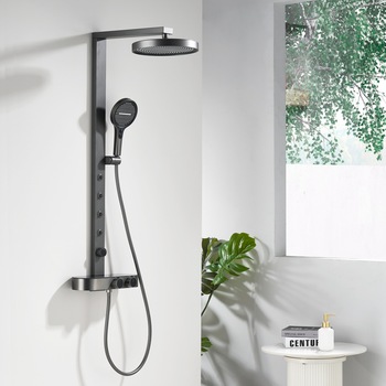 Tunç gri termostatik musluklar pirinç sıcak soğuk su duş seti ev kullanımı için büyük düz raf bel sprey güçlendirici banyo